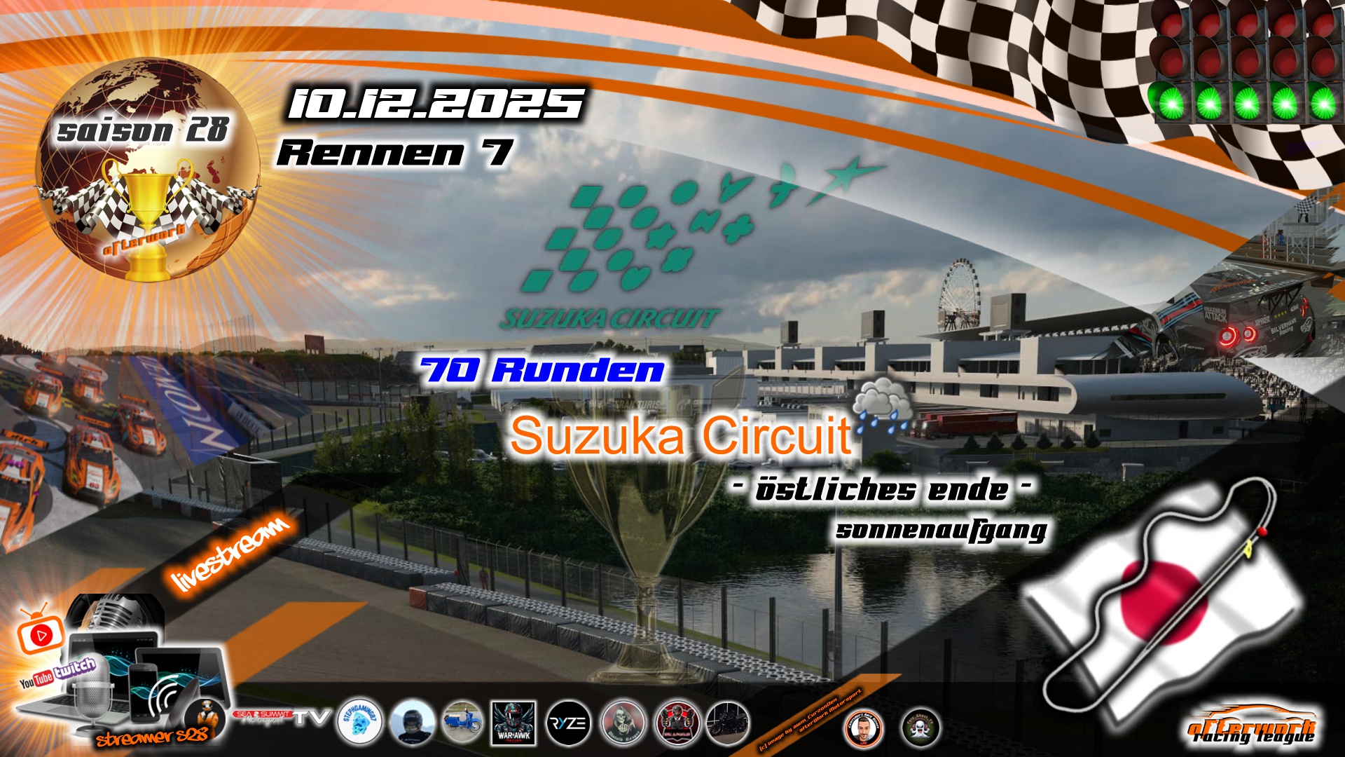 Ansonsten startet das erste Rennen der Saison 28 am 29. Oktober. Bis zum 19. Oktober muss jeder sein Fahrzeug gemeldet haben und am 22. Oktober wird es wie gewohnt die Live-Streckenauslosung mit Maggo13 auf unserem unserem Twitchkanal unter https://www.twitch.tv/afterwork_motorsport_tv geben.