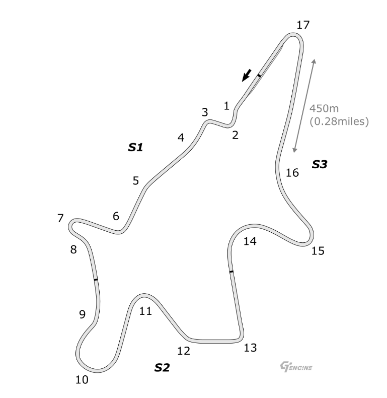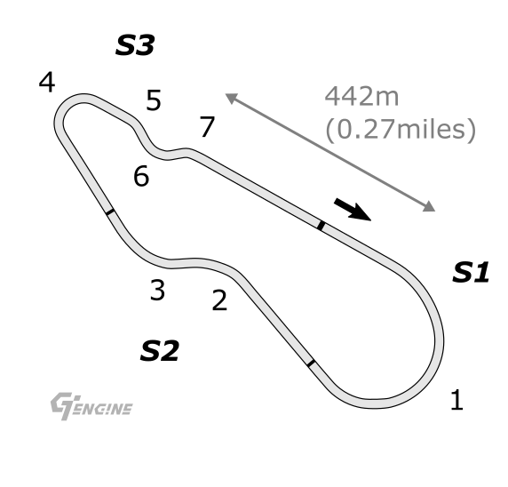 Die Strecke ist kompakt gehalten und besteht aus sieben klar definierten Kurven, verteilt auf drei Sektoren. Entscheidend für eine gute Rundenzeit sind eine präzise Linienwahl und ein gleichmäßiger Rhythmus.