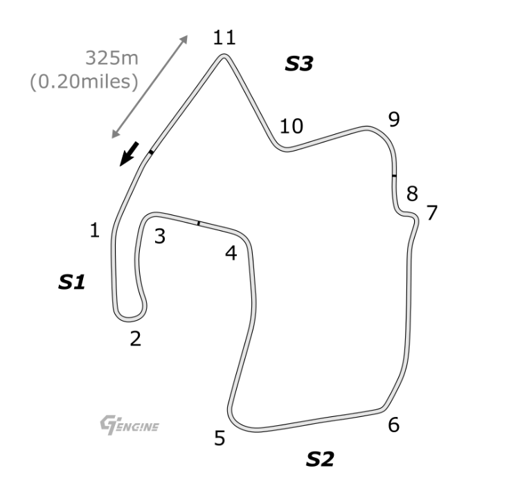 Kurve 10 ist eine zügige Rechts, die in die letzte harte Bremspassage überleitet. Nach einer kurzen Geraden folgt schließlich Kurve 11 – eine enge Linkskurve, die höchste Konzentration erfordert. Da man hier nur langsam hindurchkommt, entscheidet dieser Punkt oft darüber, ob man Zeit gewinnt oder Plätze verliert.
